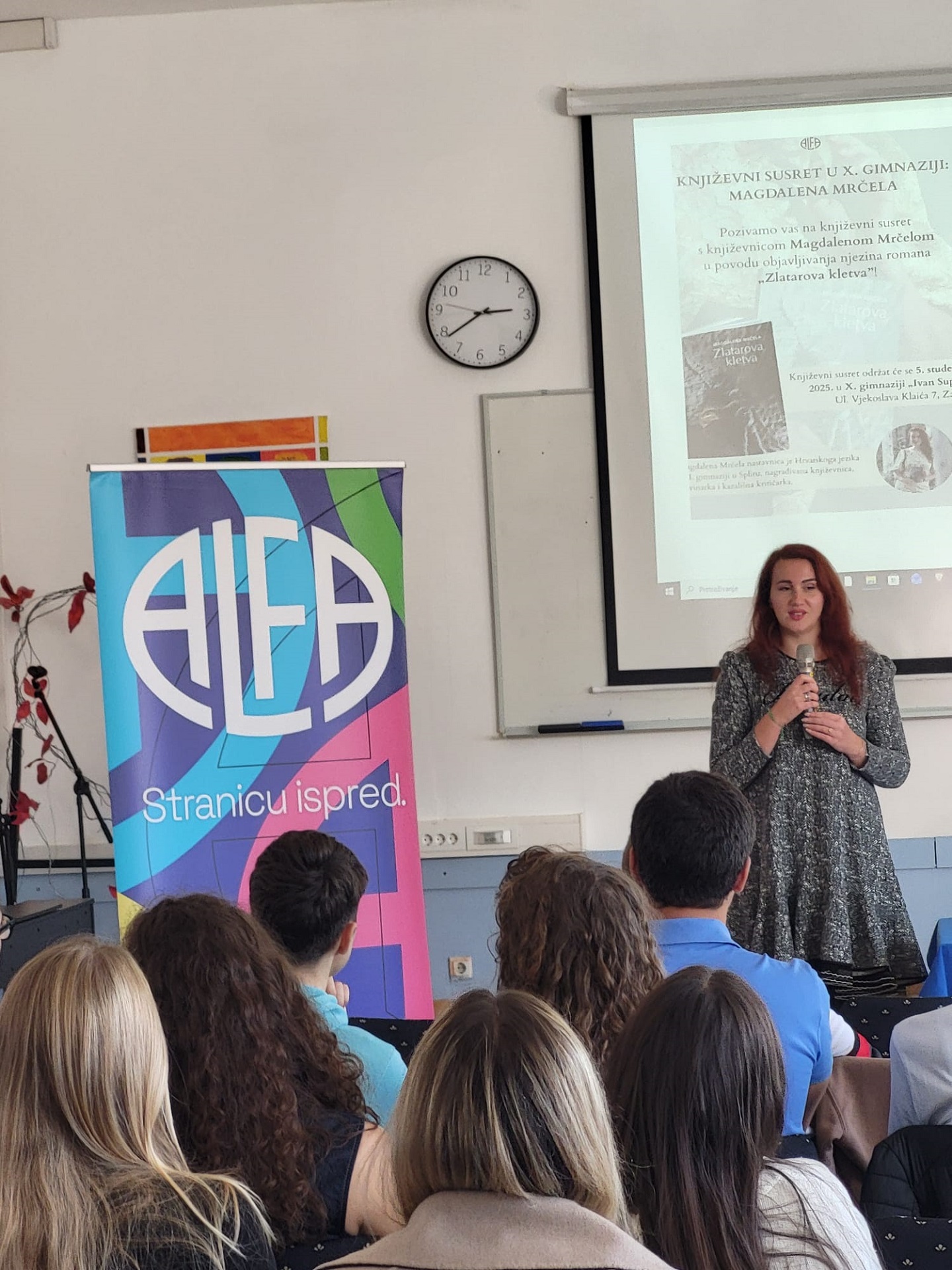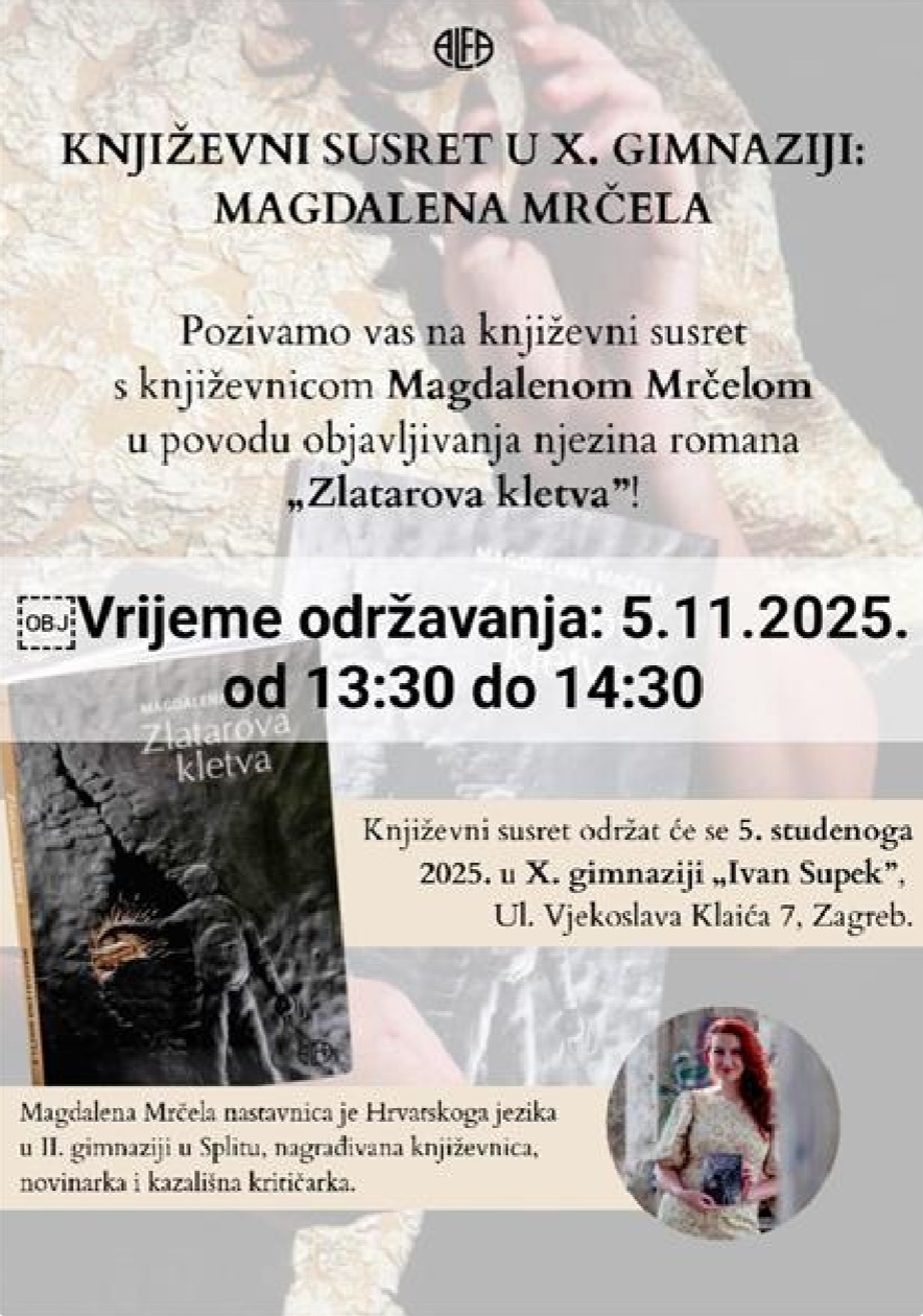 Književnica Magdalena Mrčela posjetila je X. gimnaziju Ivan Supek 5. studenog kako bi predstavila svoj roman Zlatarova kletva, nastavak Šenoine knjige Zlatarovo zlato. Zahvaljujemo autorici na zanimljivom predstavljanju i raspravi s učenicima. Također zahvaljujemo na tri poklonjene knjige (Zlatarova kletva, Osvetnici i Između) koje se mogu posuditi u knjižnici X. gimnazije.