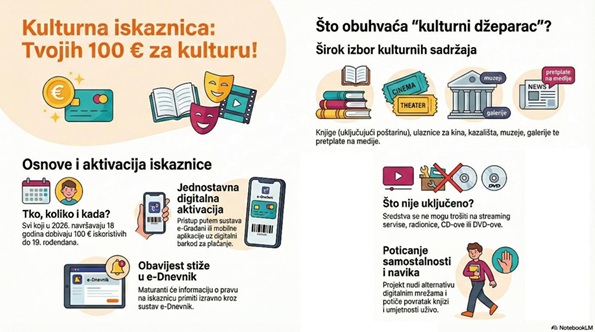 Ovaj priručnik sastavljen je kako bi profesorima u srednjim školama pružio sveobuhvatan uvid u pilot-projekt Kulturna iskaznica, koji Ministarstvo kulture i medija provodi u suradnji s Financijskom agencijom (FINA). Svrha priručnika je generaciju koja u 2026. godini navršava 18 godina informirati o mogućnostima koje im ovaj „kulturni džeparac“ otvara na pragu punoljetnosti.