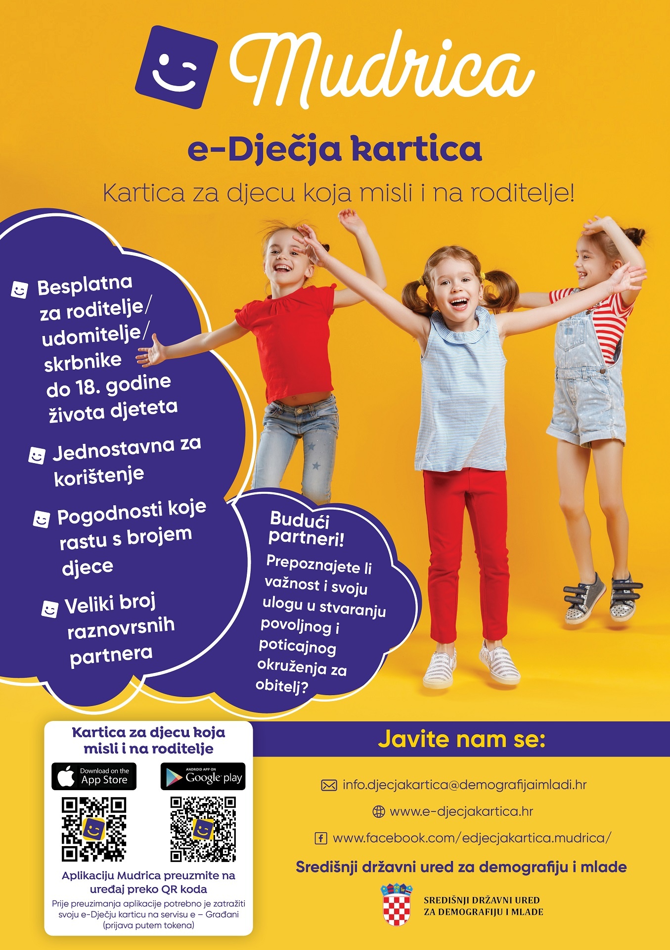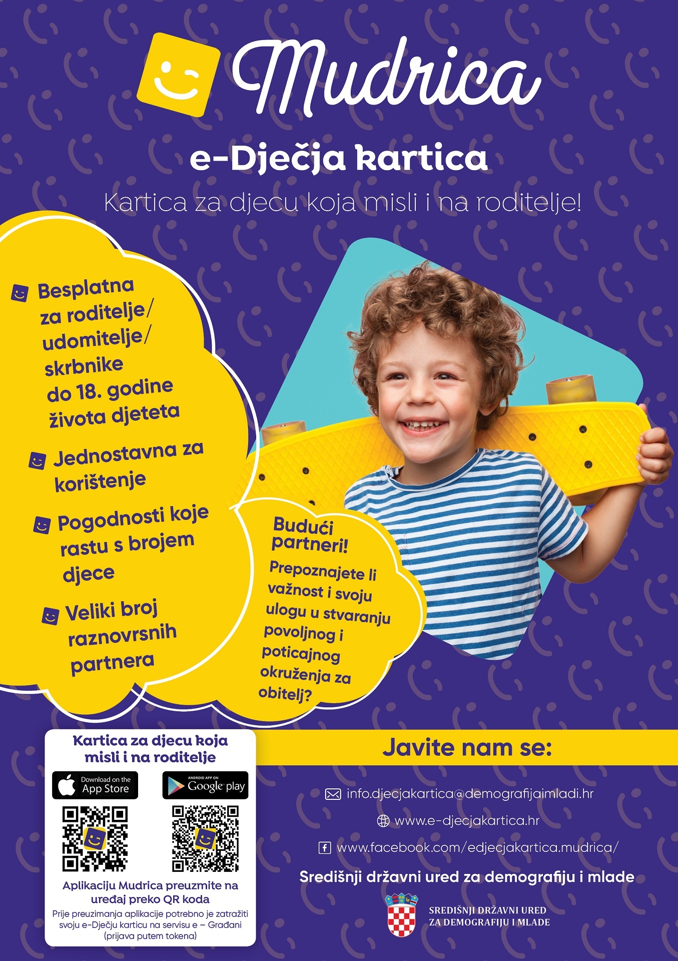 Središnji državni ured za demografiju i mlade pokrenuo je projekt e-Dječja kartica ”Mudrica”, jednu od novih poticajnih mjera obiteljske i populacijske politike. E-Dječja kartica namijenjena je roditeljima, udomiteljima i skrbnicima, a čije korištenje omogućuje razne pogodnosti ili popuste na proizvode ili usluge kod dogovorenih partnera iz javnog i privatnog sektora.